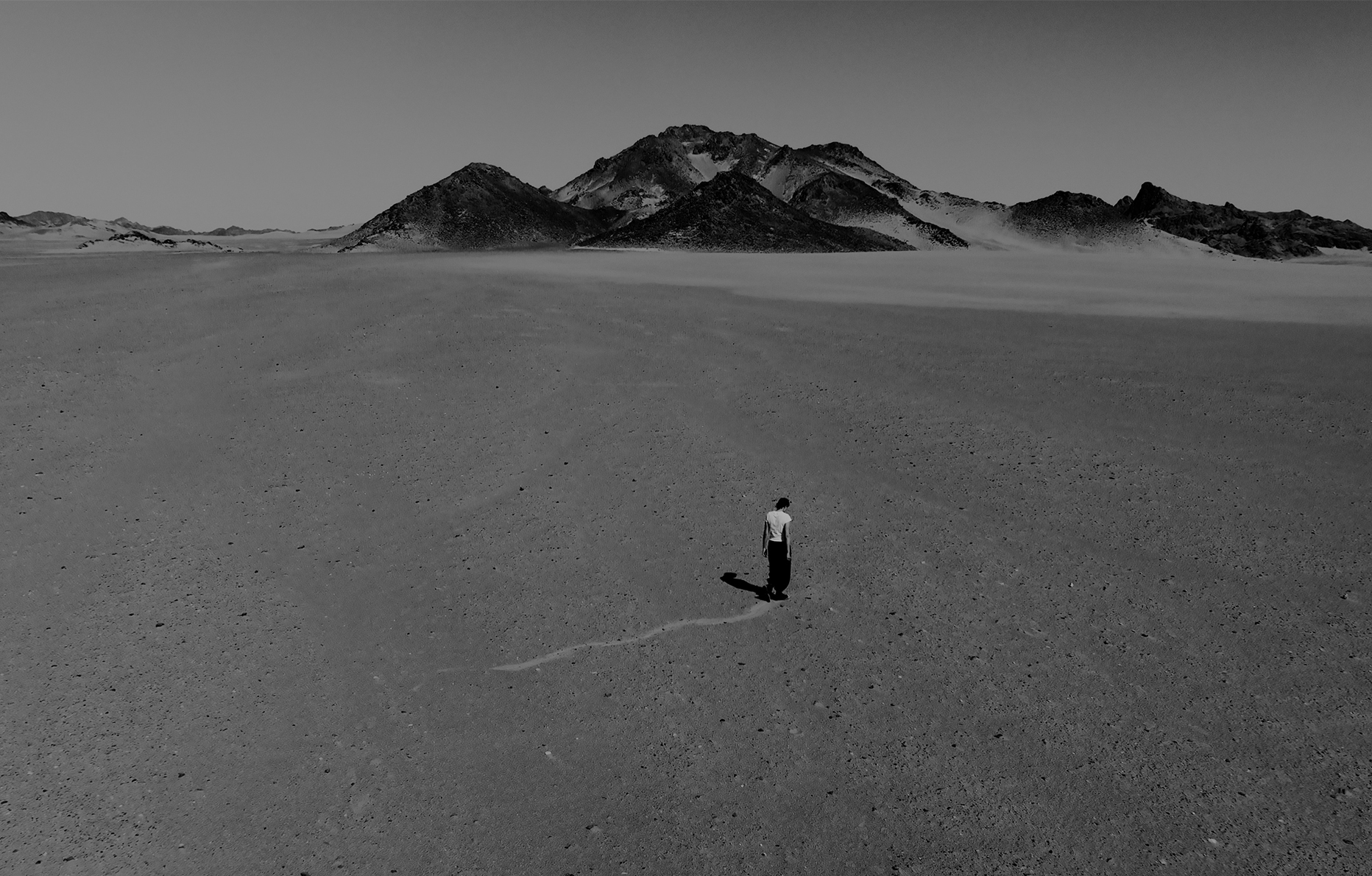 Ces œuvres explorent sur un mode introspectif la psychogéographie. Fondé sur l’idée que les lieux infléchissent les émotions et le comportement humain, ce concept – défini par Guy Debord en 1955 et inspiré par la figure baudelairienne du flâneur – propose une approche informelle et iconoclaste de l’exploration de l’espace urbain. Cette approche infuse dans la pratique artistique de Sarah Brahim où le mouvement, la marche et la présence physique sont les outils essentiels pour appréhender et découvrir les récits cachés d’un lieu. Avec le panorama spectaculaire d’AlUla pour toile de fond, ces œuvres font écho à des rituels ancestraux tout en retraçant un lien profond entre corps et paysage. Restituée dans la vidéo, la performance solo de Sarah Brahim effectuée sur place découle d’un poème qu’elle a composé lors de ses récents voyages dans la région.