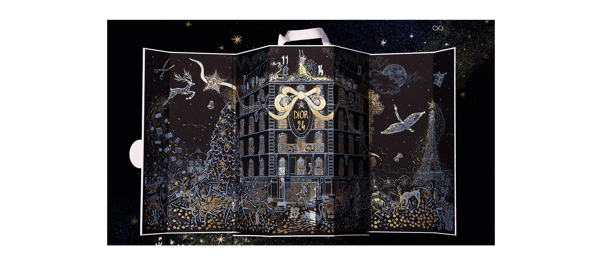 Sous les crayons de l’illustratrice Safia Ouares, le calendrier de l’année invite à la visite de l’adresse historique de la maison, au 30 avenue Montaigne sous un ciel étoilé. Vingt quatre cadeaux se dissimulent derrière les fenêtres. Calendrier de l’Avent, DIOR. 350 euros. En vente aussi en grands magasins.