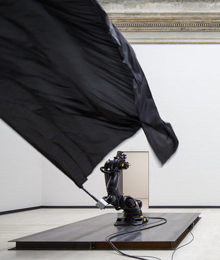 All the pieces, bar one from 2007, were created over the course of the past four years. If technology can be used in an enlightened manner, Forsythe embraces it. In Black Flag (2014), two 60-foot-tall robotic arms each clasp a sheet of pitch-black silk, waving it with godlike power and grace. To orchestrate the motions, Forsythe had to work around the original programming. “They had an actual history of being used in industry,” he explains. “Then they come into our context and they’re used poetically, choreographically, they’re very beautiful. Then, [when we’re done], they go back into industrial obscurity.” But a simple, tech-free premise can be just as impactful too. In Towards the Diagnostic Gaze (2013), a feather duster rests on a stone pedestal, which is engraved with the simple instruction “Hold the object absolutely still.” As anyone who has made a serious effort to do so can attest, this is an impossible task. “You simply can’t do it!” exclaims Forsythe, who was in the midst of cleaning his studio one day before he became sidetracked by this gradual realization. “Your entire body is dilating, imperceptibly, constantly. Your blood pressure, plus your nerves and your muscles, are not in a steady state.” While the robotic limbs depend on humans to decide whether they’re immortal or disposable, the slight quiver of a feather duster reminds us, as humans, of our innate condition. “It has nothing to do with strength, will or strategy… The only way you can stop while holding it is to not be living,” he concludes. In the meantime, Forsythe has been mulling over his own role as an artist who is principally known as a choreographer. “In all the arts, you cannot insist on interpretation. But I think bringing subjects to the table is essentially what artists should do.”