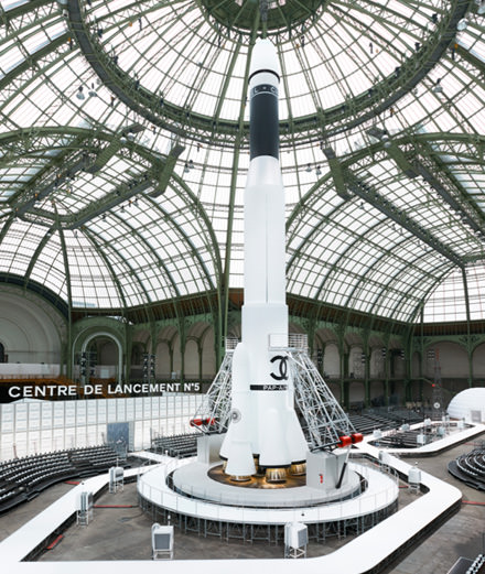 This season Karl Lagerfeld sends Chanel to the heart of the constellations. At the Grand Palais, near a 37 meters high rocket, 90 models wearing glittering boots and reworked tweed tailors are outbound for space.