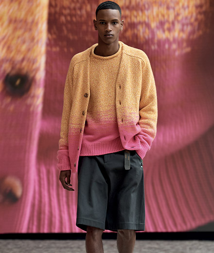 In this men’s wardrobe, with its gentle colours (celadon, carbon, pink, greige), chic and nonchalance are intertwined in a mixture of materials and techniques. We thus find trousers with flared pleats and Bermuda shorts worn with loose cotton poplin shirts in the house’s historic “Mors” and “Gourmettes” prints. Adding a pop touch to this collection teetering between elegance and casualness, certain cardigans and jumpers are printed with daisies, while others are presented in acidic tones punctuated with dip-dye effects.