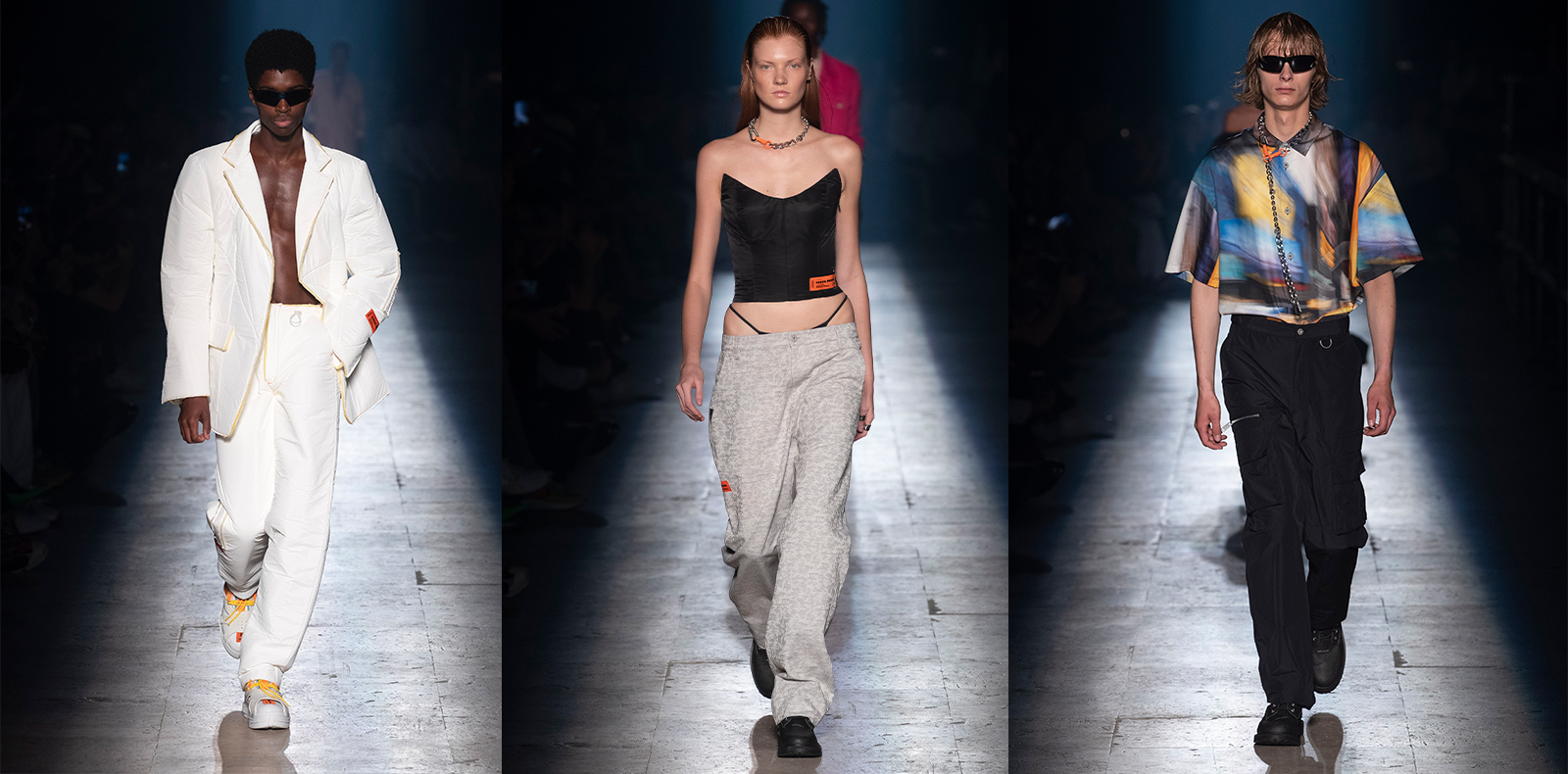 In the Galerie Vivienne in Paris, place where Kenzo Takada presented his first show in the French capital in 1970, Nigo seems to walk in the fashion house founder’s shoes as the new artistic director. As expected, colours and motifs abound through myriads floral prints, such as the house’s emblematic Poppy print and floral compositions painted with aquarelle and printed all over matching pieces, but also through thin or tiger-like stripes, revisited tartan or Prince of Wales’ styles, as well as many bright red, green, blue and yellow colours that bring a very spring-like and optimistic spirit to this wardrobe. Regarding designs’ cuts, the Japanese creator is diametrically opposed to streetwear fashion, with his particularly preppy wardrobe defined by numerous shirts and midi shirt dresses, ties, three-piece suits with large and fitted pants, but also with berets as an inkling to foreigners’ stereotyped vision of Parisians. Nonetheless, Nigo has slightly shaken up these conformist outfits with the recurring use of Japanese denim, the association of teddys and other colored knitted sweaters, straight dresses and pants, or the creation of two-tone jackets characterised by strong and contrasting vivid colours. The whole offers an eccentric touch to the Japanese fashion house.