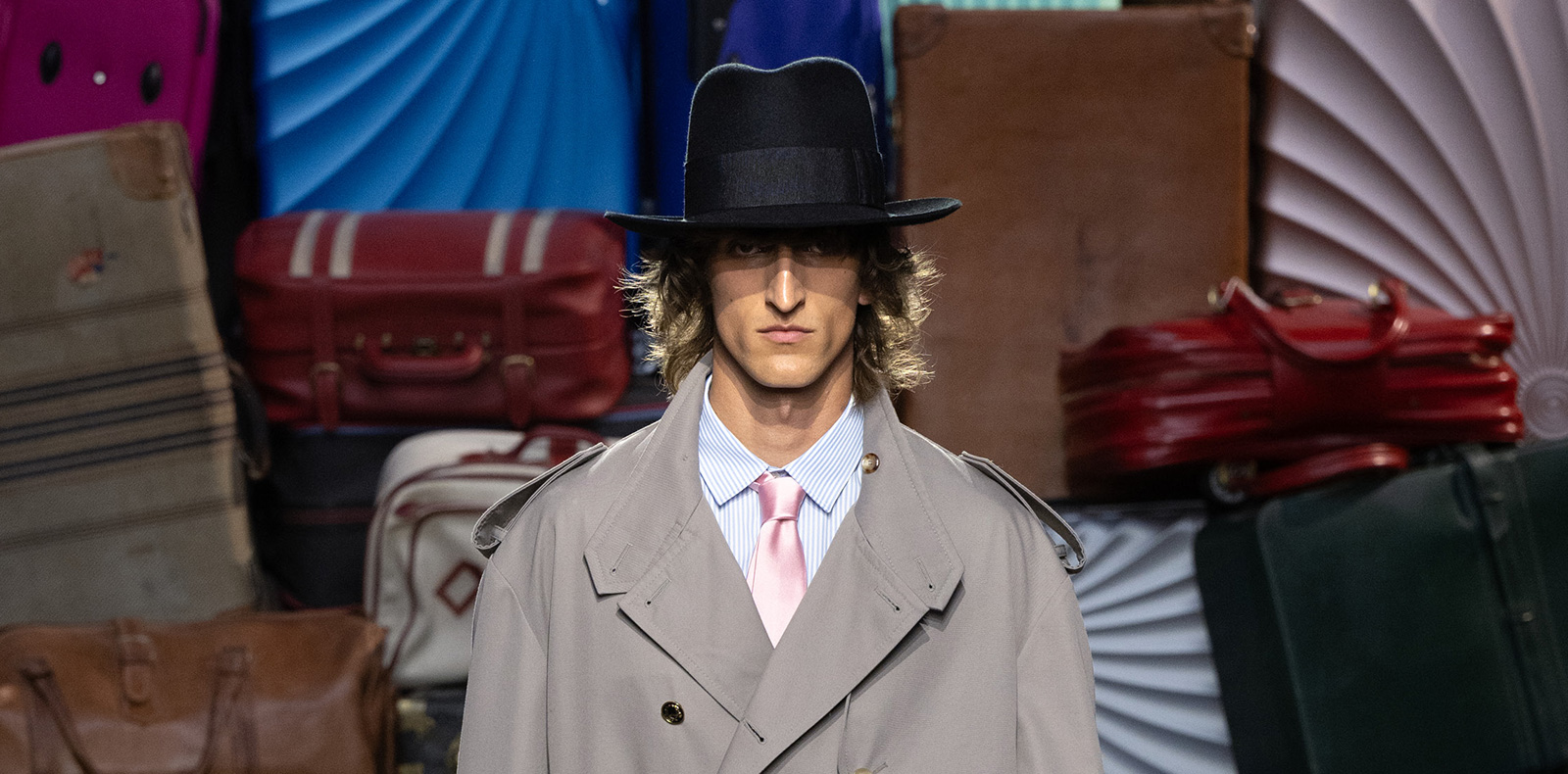 Dès l’apparition des premières silhouettes sur un podium entouré de valises entassées, le styliste argentin rend un puissant hommage à l’histoire de la maison fondée en 1983 par l’irrévérencieux Franco Moschino (1950-1994). Les couleurs pop contrastent avec certains looks en apparence assez classiques, qui se voient tous dotés d’un détail inattendu, prenant la forme d’une broche ou encore d’un couvre-chef.