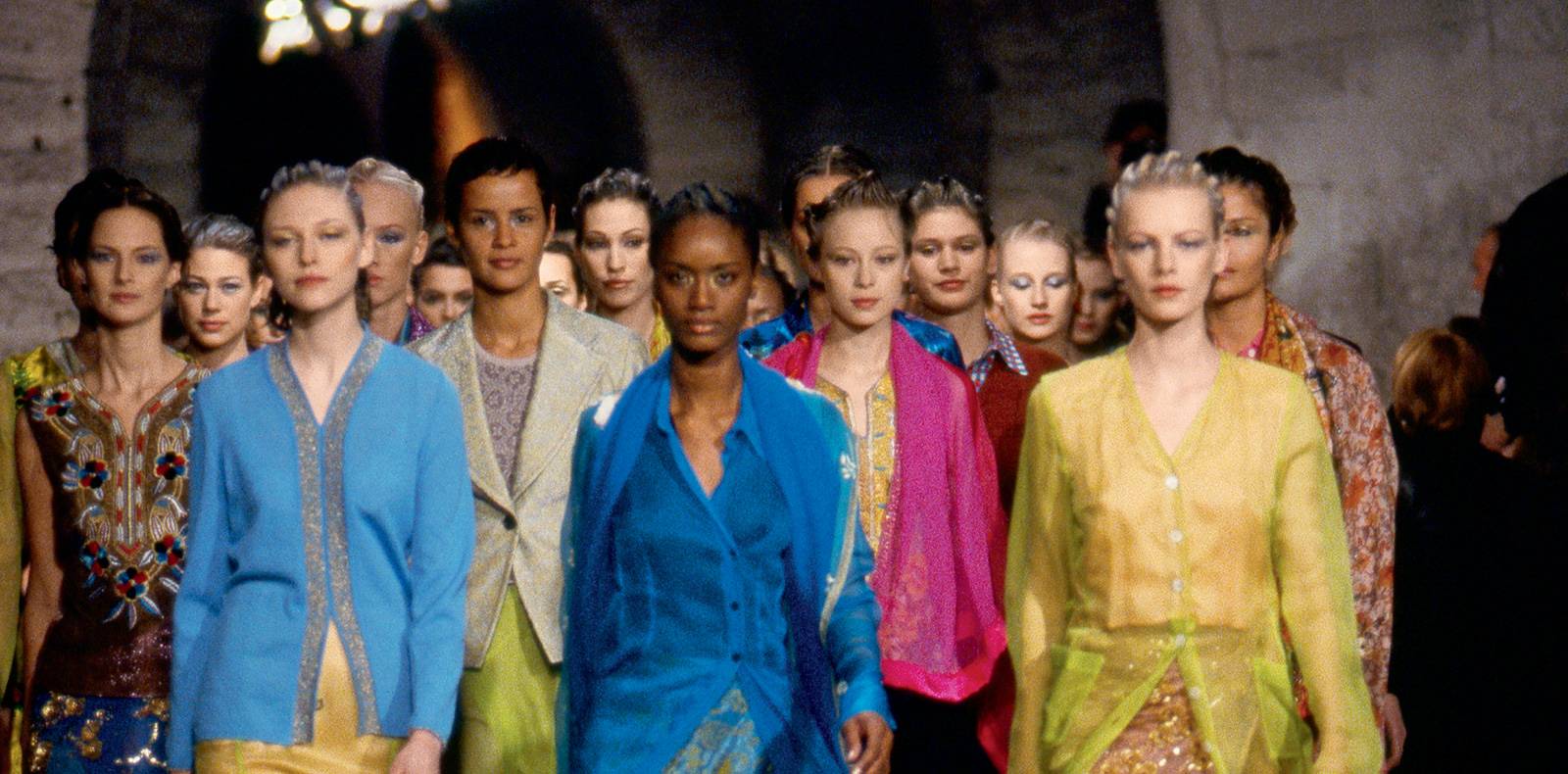 Sur des robes légèrement transparentes ou des ensembles composés d’une chemise et d’un pantalon large, les couleurs vibrantes des photogrammes contrastent avec des looks monochromes telles que les silhouettes 30 et 33. En somme, les nuances de l’arc-en-ciel explosent sur le podium, et viennent ainsi animer un vestiaire classique et élégant.